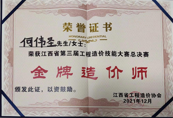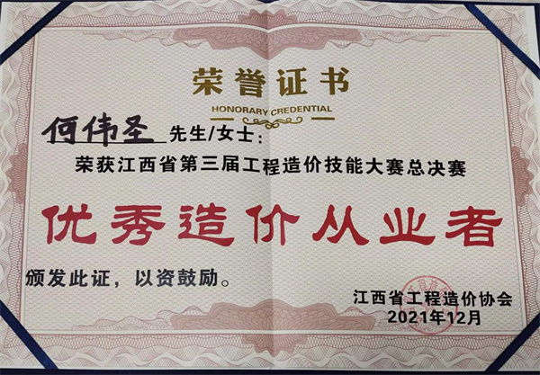 2021年“江西省第三届工程造价技能大赛”于12月14日在南昌市落下帷幕!大赛历时8个月,共三个赛段,我司员工积极备战,经过紧张的角逐,最后两人成功入围总决赛。其中宜春分公司何伟圣在总决赛上过关斩将荣获团队赛亚军,并获得“金牌造价师”“优秀造价从业者”等荣誉称号。